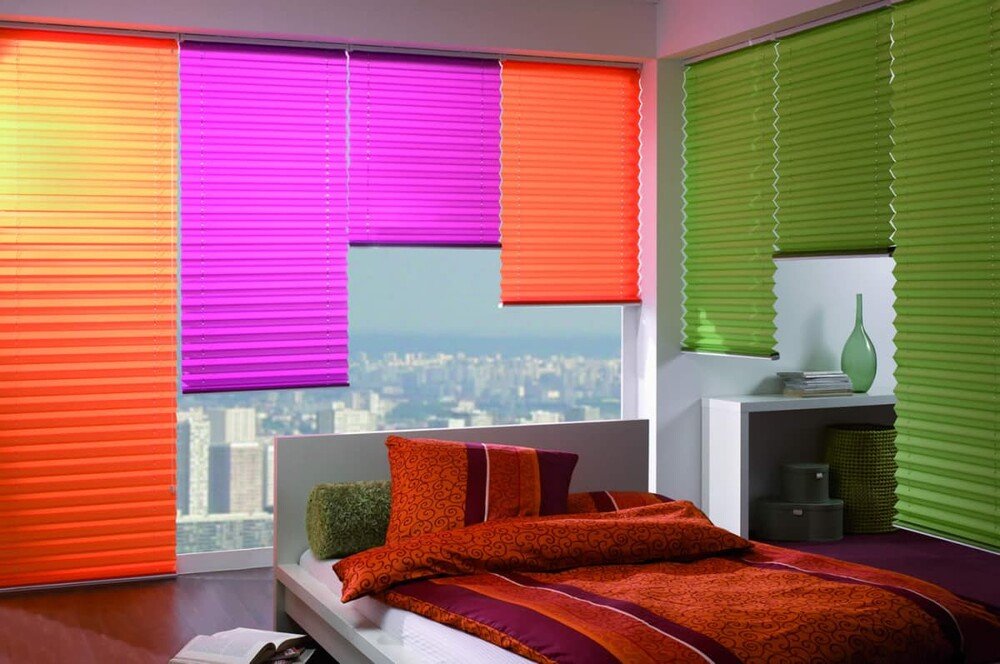 - Эклектика. Здесь яркие желтые шторы плиссе сочетают с глубокими синими, зелеными или красными тонами для создания живого и динамичного пространства.