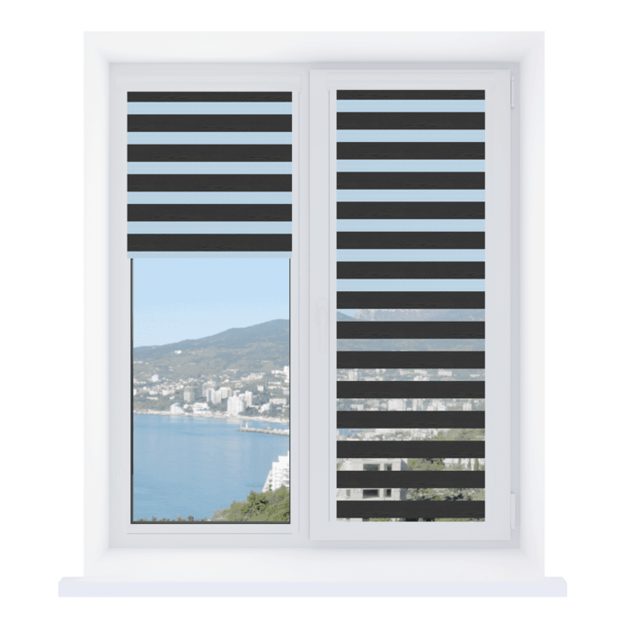 Закрытые рулонные шторы «день-ночь» – конструкция из двойного полотна, состоящего из чередующихся прозрачных и непрозрачных горизонтальных полос, которые можно сдвигать относительно друг друга для регулировки света. Тип «закрытый» означает, что механизм с валом ткани спрятан в защитный короб, который придает шторе эстетичный вид и защищает полотно от пыли и грязи.